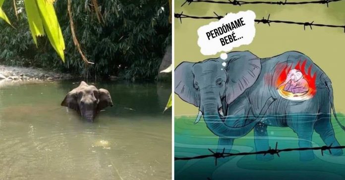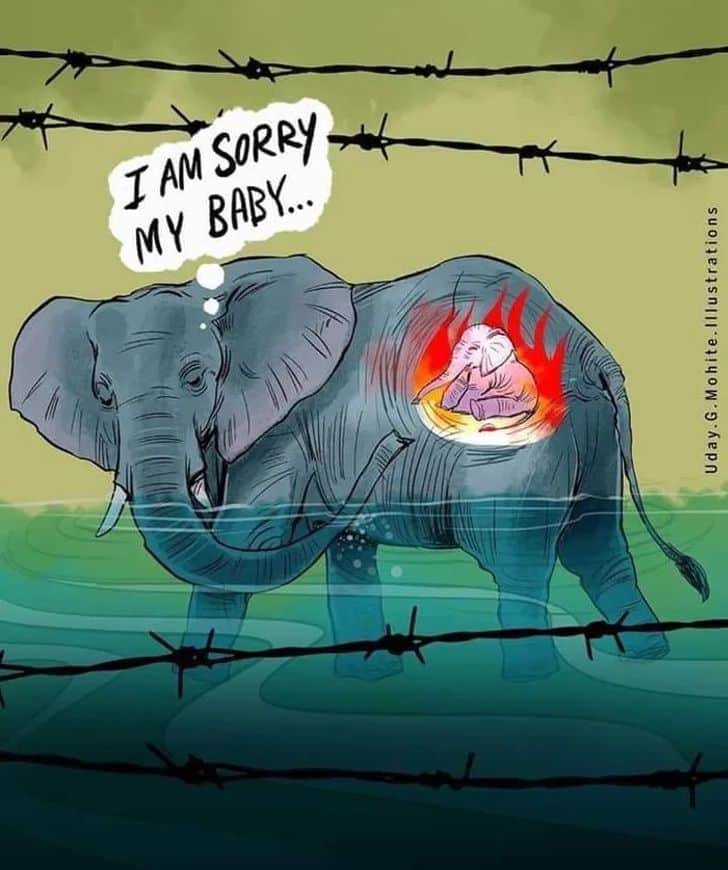 O ocorrido foi divulgado pela Sky News. Na Índia, Floresta do Vale Silencioso de Attapadi, Kerala, o zelador se viu alarmado quando notou que junto ao rio, estava o corpo de uma elefanta grávida. Alguém dera ao animal um abacaxi cheio de explosivos, o que veio a matar a mãe e o bebê que carregava em seu ventre.