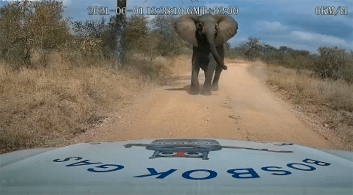 Segundo Nukeri, ele fez barulhos para espantar alguns animais na estrada, algo que geralmente funciona – mas não dessa vez. Um dos elefantes que havia se afastado do veículo parecia estar planejando apenas um impulso para se chocar contra o seu capô.