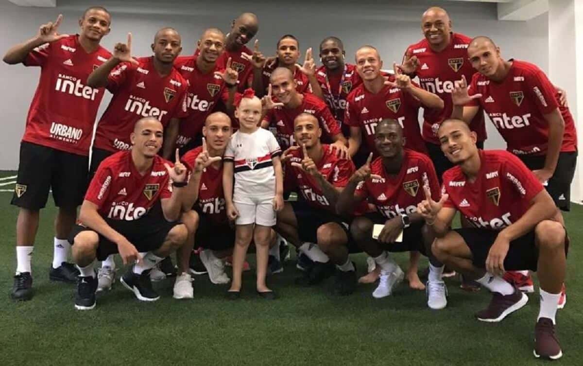 Ao lado de Larissa, os jogadores do São Paulo posaram para uma foto. Todos eles sinalizaram a letra “L” com as mãos. “Olha só quem chegou junto com o time aqui no estádio! A pequena guerreira Larissa foi homenageada pelos garotos, que rasparam a cabeça. Cena linda!”, escreveu o clube nas redes sociais.