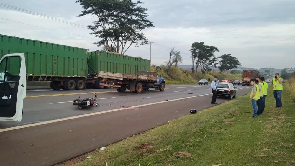 A redução de faixas na rodovia, resultou em um trânsito mais lento, fazendo com que um motoqueiro colidisse com a traseira de um caminhão.
