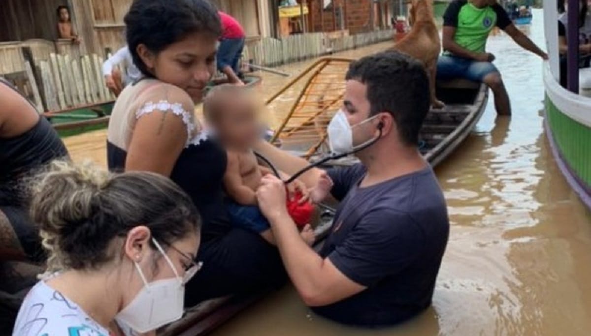 Uma cena protagonizou a situação nesse último domingo (21): um médico atende uma criança dentro da água. “Essa criança tem dois anos e está com pneumonia.”