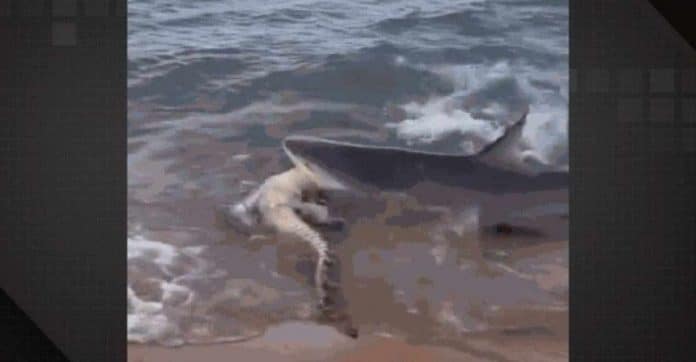 A cena, gravada por Bedwell, revela o predador arrastando o réptil em direção ao mar.