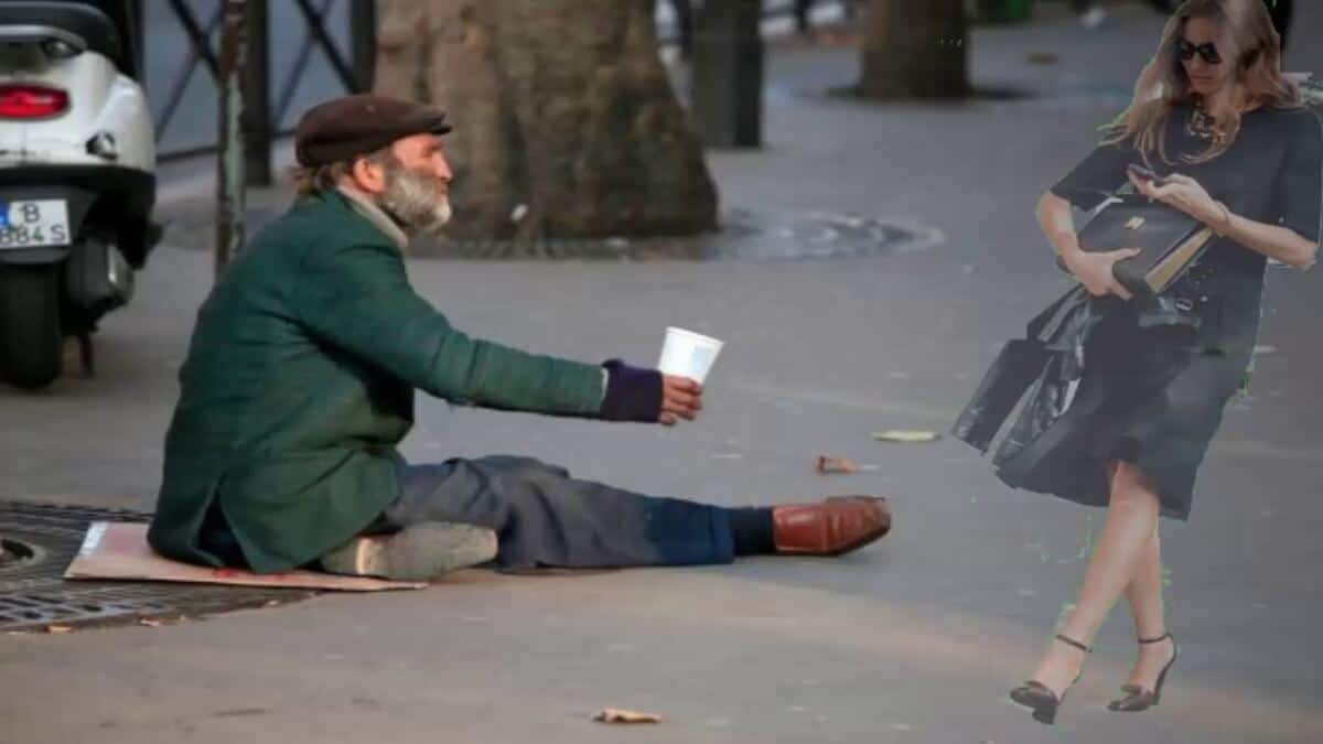 Certo dia, uma mulher avistou um mendigo, sentado numa calçada na Rua..