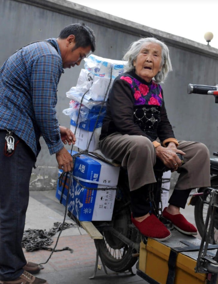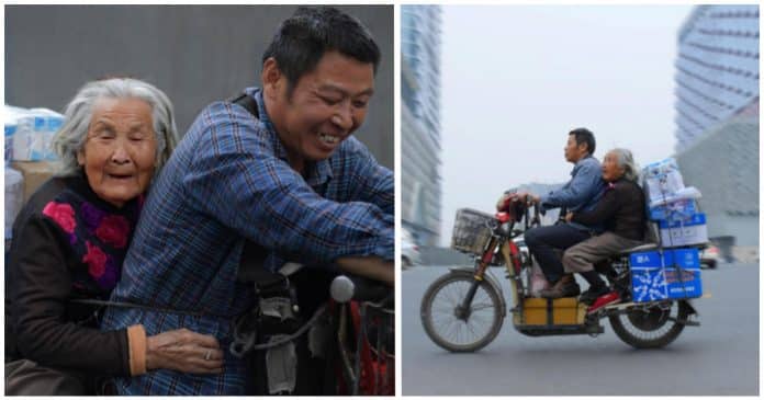 Cai Yujun é um chinês de 52 anos que trabalha como entregador na cidade de Sichuan, no sudoeste do país asiático e há sete anos faz seu trabalho acompanhado de sua mãe, uma idosa nonagenária.