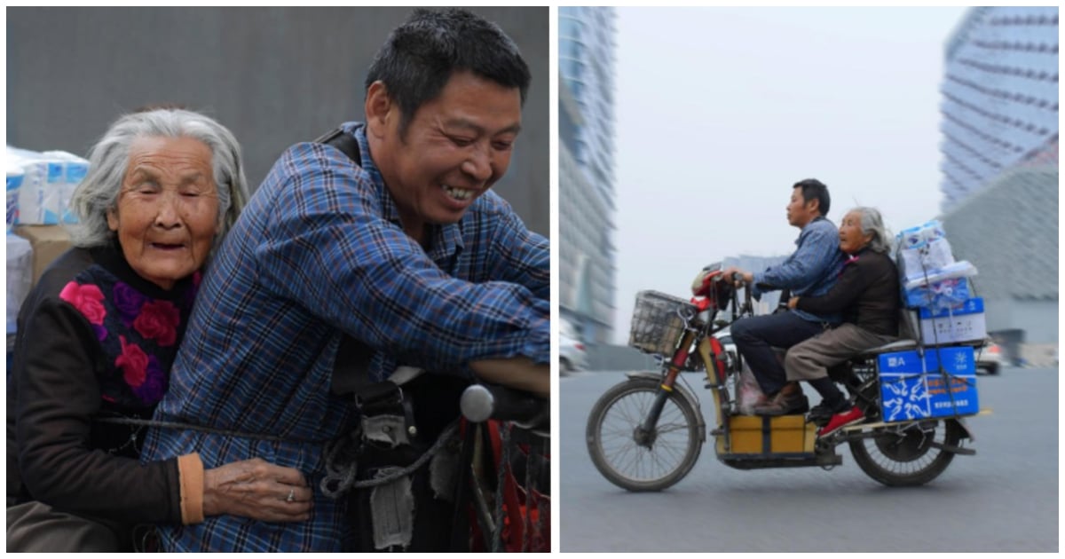 Cai Yujun é um chinês de 52 anos que trabalha como entregador na cidade de Sichuan, no sudoeste do país asiático e há sete anos faz seu trabalho acompanhado de sua mãe, uma idosa nonagenária.