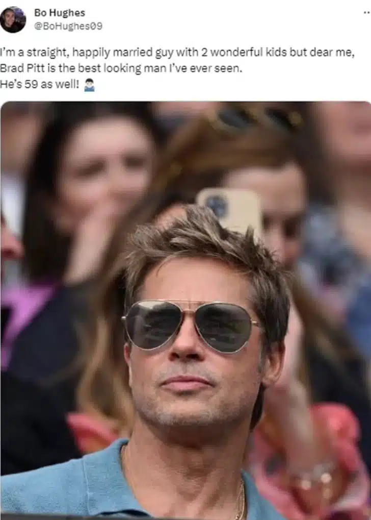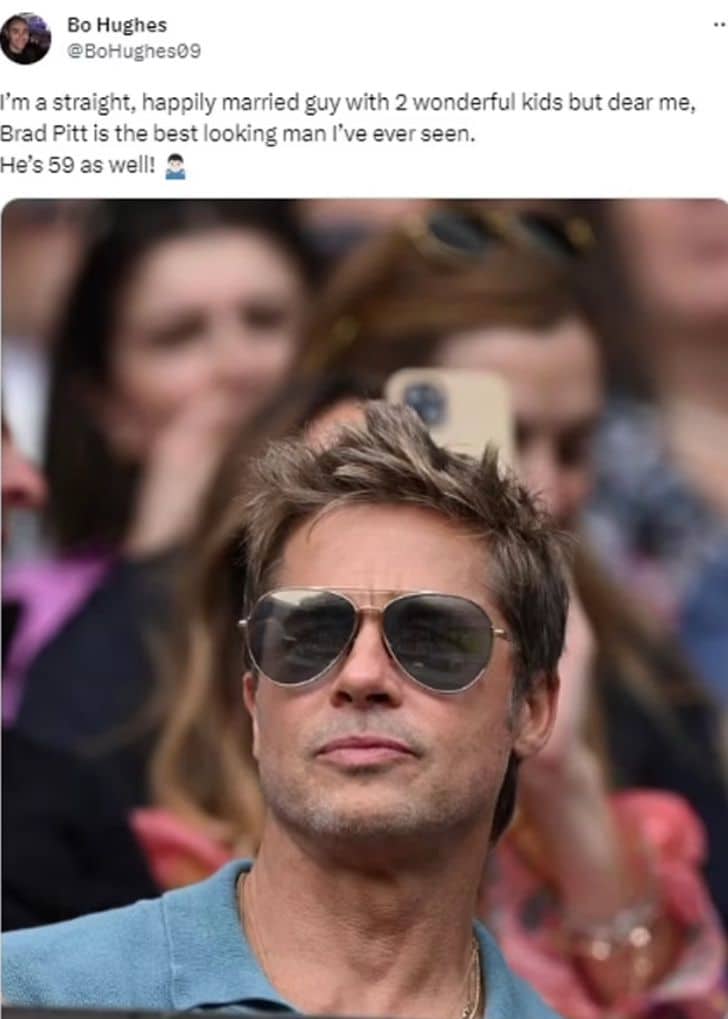 “Sou hétero, casado e feliz com dois filhos lindos, mas nossa, Brad Pitt é o homem mais bonito que já vi . E ele tem 59 anos.” Disse um internauta.