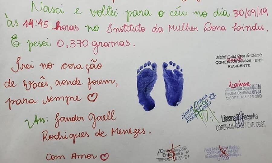 Por conta de uma infecção grave uma mãe perdeu seu bebê, após 21 semanas e 3 dias de gestação; E a equipe de enfermagem do Instituto da Mulher Dona Lindu resolveu fazer essa linda carta de despedida da criança para a mãe e o pai com o carimbo do pezinho do seu bebê, com o intuito de amenizar um pouco mais a dor da perda de seu filho.