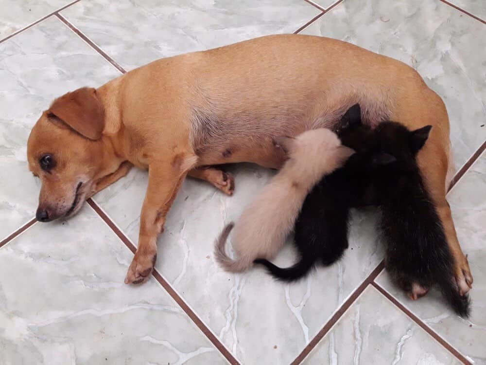 Alzira conta que grande foi a sua surpresa quando chegou em casa e viu a Rhadija deitada, amamentando os gatinhos! Anteriormente, havia já notado uma inquietação da cachorrinha com a presença dos gatinhos, mas não imaginava que seria esse o desdobramento da situação.