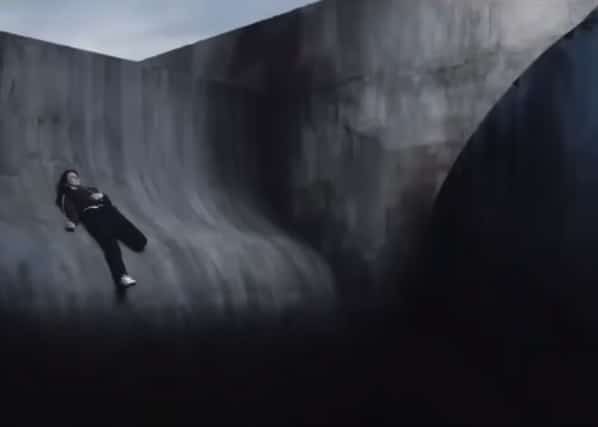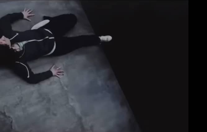 O cenário é vazio e desolador, com apenas uma parede de concreto que a impede de se segurar.