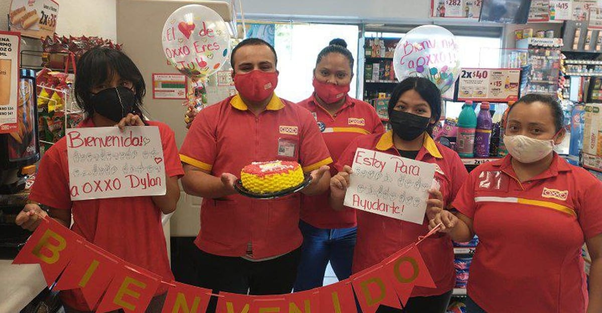 “Bem-vindo à Oxxo, Dylan”, pode ser lido em uma das placas seguradas por um funcionário. Além disso, os funcionários se esforçaram para traduzir os escritos em linguagem de sinais para que seu novo colega se sentisse incluído.