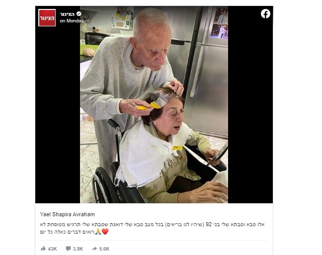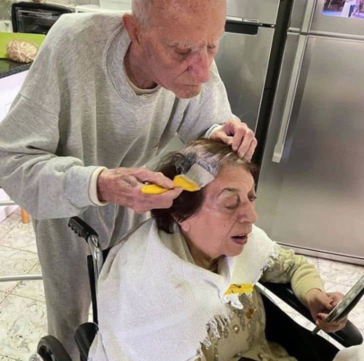 Junto com essa mensagem, ele compartilhou a fotografia em que seu avô é visto enquanto pinta o cabelo dela, que ao mesmo tempo se olha no espelho, para verificar se tudo sai bem. Esse par de velhos israelitas compartilhou a vida inteira e, obviamente, nessas circunstâncias adversas, eles estavam mais próximos do que nunca.