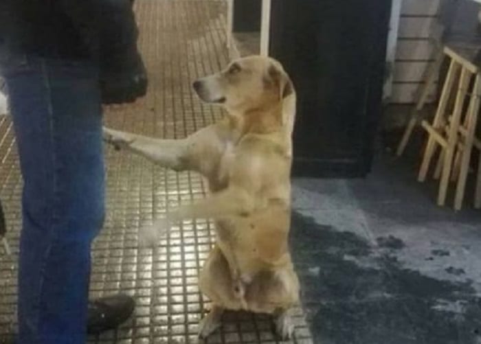 O cachorro senta-se sobre as patas traseiras como um verdadeiro cavalheiro e estende as patas dianteiras aos transeuntes, pedido alimento.