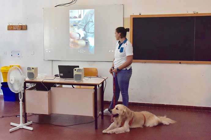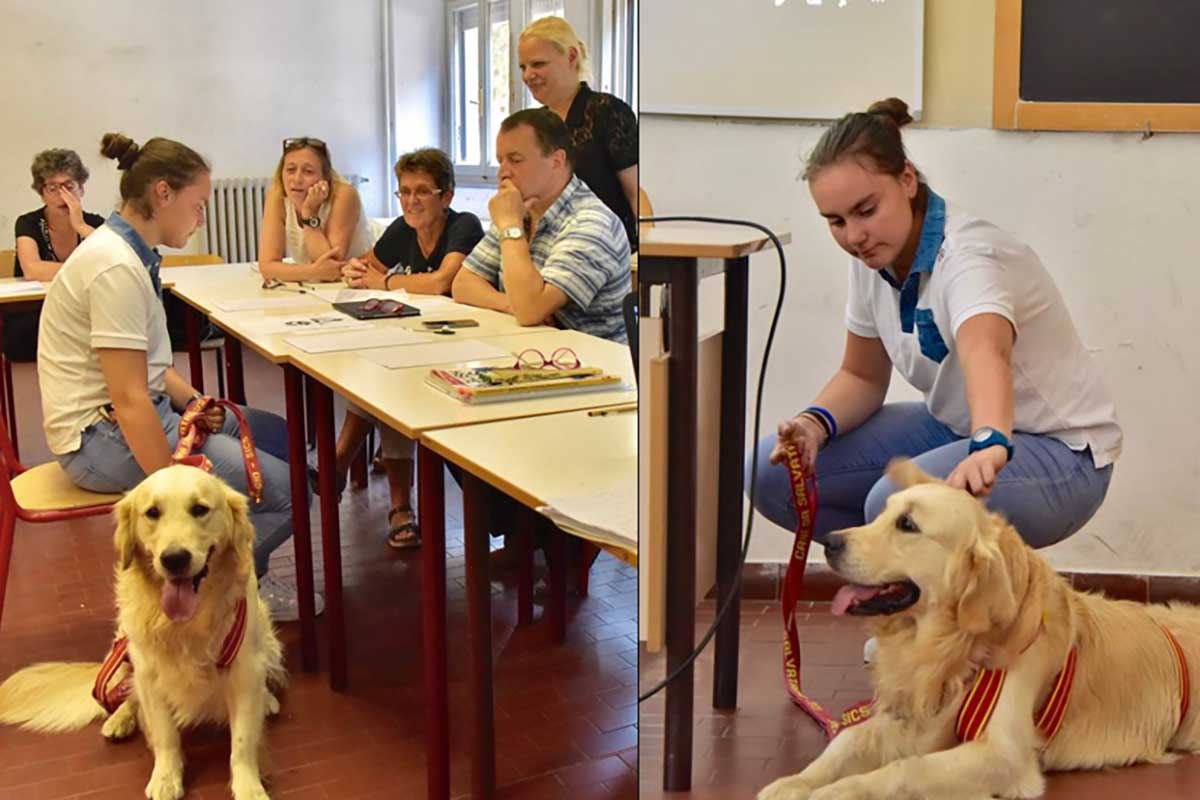 Durante a apresentação, o amigo balançava o rabinho enquanto a estudante discorria acerca dos seus aprendizados.
