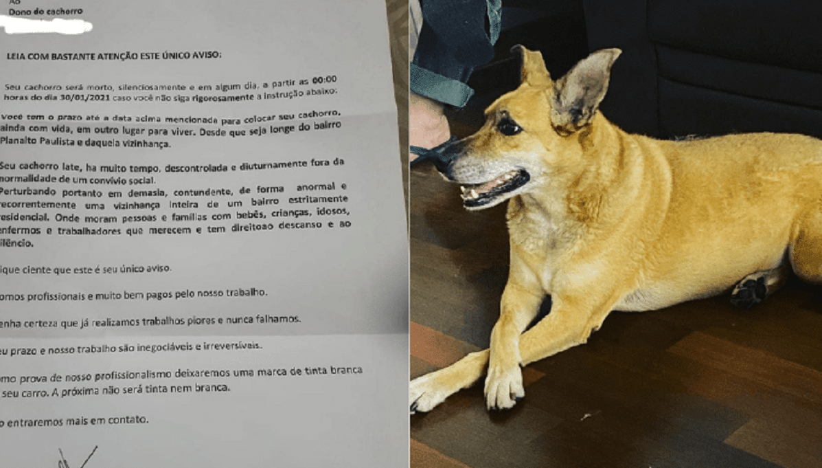 O motivo dessa ameaça seria os latidos “fora da normalidade de um convívio social” do animal. “Fique ciente que este é seu único aviso. Somos profissionais e muito bem pagos pelo nosso trabalho. Tenha certeza que já realizamos trabalhos piores e nunca falhamos”.