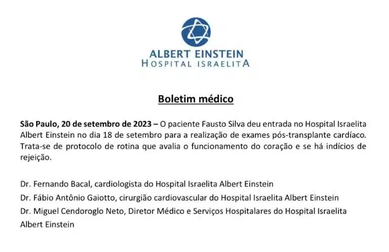 “O paciente Fausto Silva deu entrada no Hospital Israelita Albert Einstein no dia 18 de setembro para a realização de exames pós-transplante cardíaco. Trata-se de protocolo de rotina que avalia o funcionamento do coração e se há indícios de rejeição”, diz o comunicado.