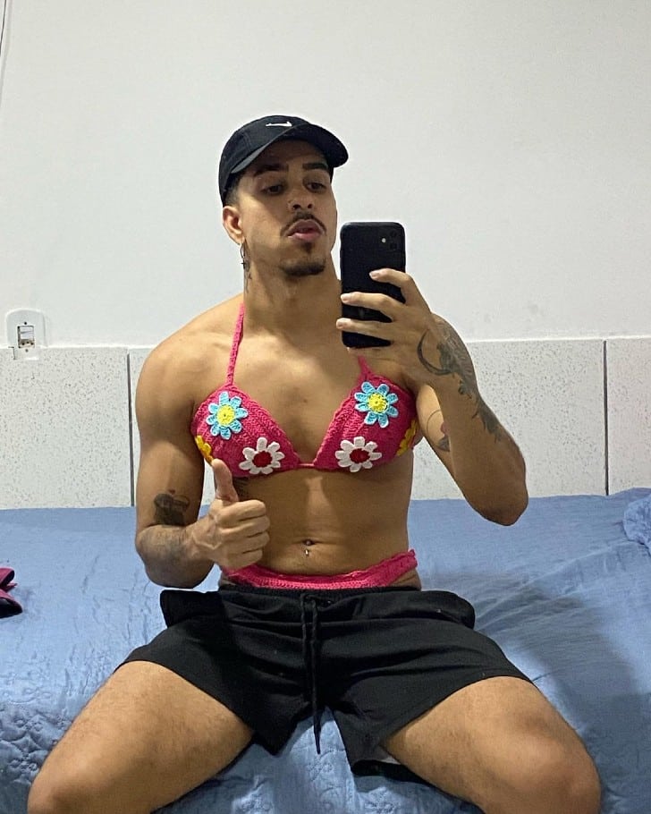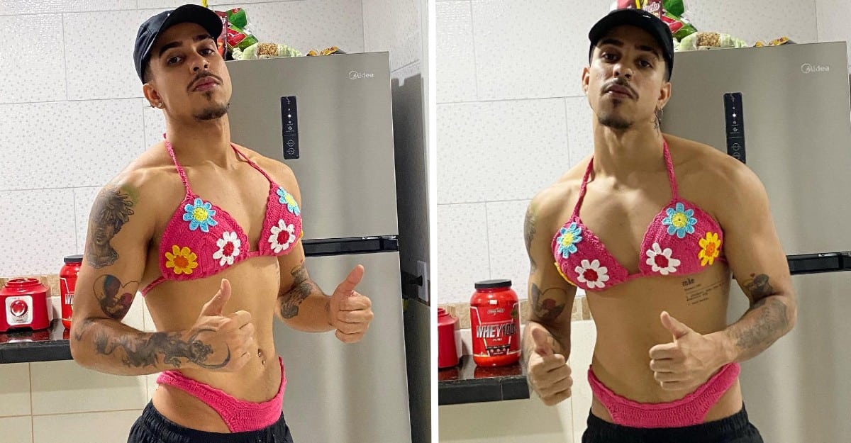 Thiago, que tem 380 mil seguidores no Instagram, pegou um dos biquínis de tricô feito à mão que sua mãe faz e posou em suas redes sociais com o design , independente das críticas ou do que dirão sobre um design completamente “feminino”.