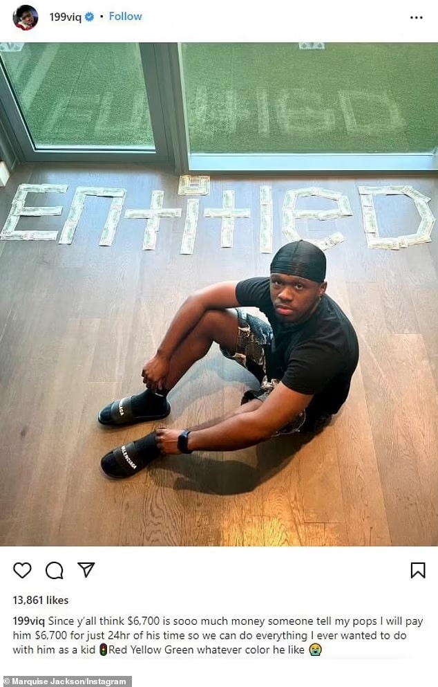 “Já que vocês acham que US$ 6.700 é muito dinheiro, alguém diz ao meu pai que eu vou pagar US$ 6.700 por apenas 24 horas do seu tempo para que possamos fazer tudo o que eu sempre quis fazer com ele quando criança”, disse em uma publicação.
