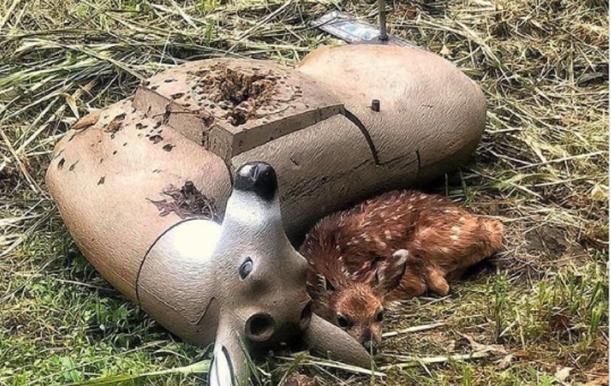 A ONG postou a imagem de um bebê cervo aninhado a um manequim de plástico na forma e tamanho de um cervo adulto. O objeto é utilizado por caçadores como alvo para treino de tiros. É possível notar como o bebê está devastado e profundamente triste buscando o acolhimento do boneco que provavelmente está sendo confundido com a mãe do filhote.