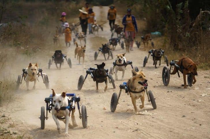 Eles correm livremente em suas ‘cadeiras de rodas’ todas as manhãs e parecem amar isso.