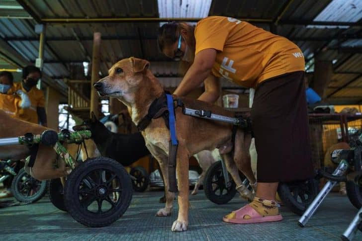 São 27 cães no total e a grande maioria deles sofreu graves acidentes e por isso precisam do uso das cadeiras adaptada paras poderem se locomover.
