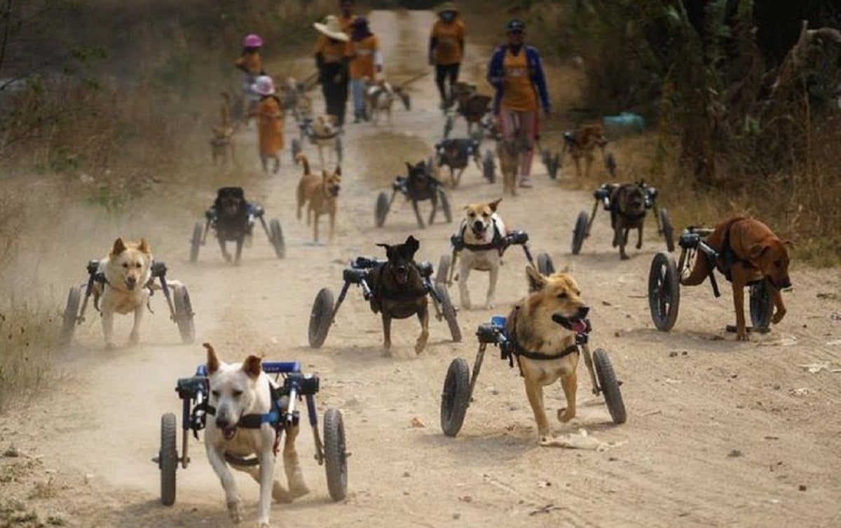 Eles correm livremente em suas ‘cadeiras de rodas’ todas as manhãs e parecem amar isso.