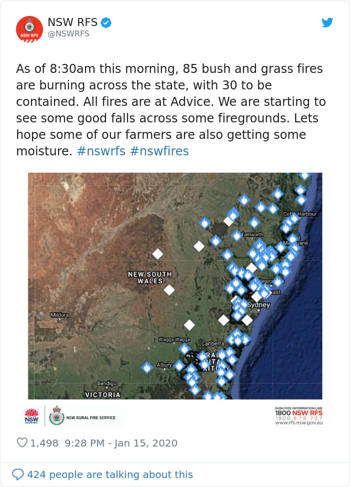 O departamento de meteorologia local relata que houve algumas “boas quedas” no estado de Nova Gales do Sul – parte do país onde ocorreram muitos dos piores incêndios florestais. O Corpo de Bombeiros Rural de Nova Gales do Sul compartilhou um vídeo da chuva caindo e escreveu: “Está aqui um alívio para vários bombeiros que trabalham em toda a NSW. Embora essa chuva não extinga todos os incêndios, ela certamente ajudará bastante na contenção. ”