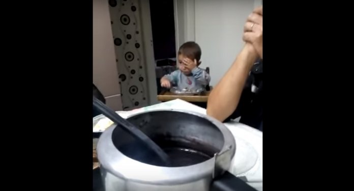 Crente no fato de que a ação passaria despercebida e que os benefícios do mal feito seriam impunemente usufruídos, um bebê foi flagrado, no que parece ser um jantar, beliscando sorrateiramente a comida do prato enquanto fingia estar orando, junto aos seus familiares.
