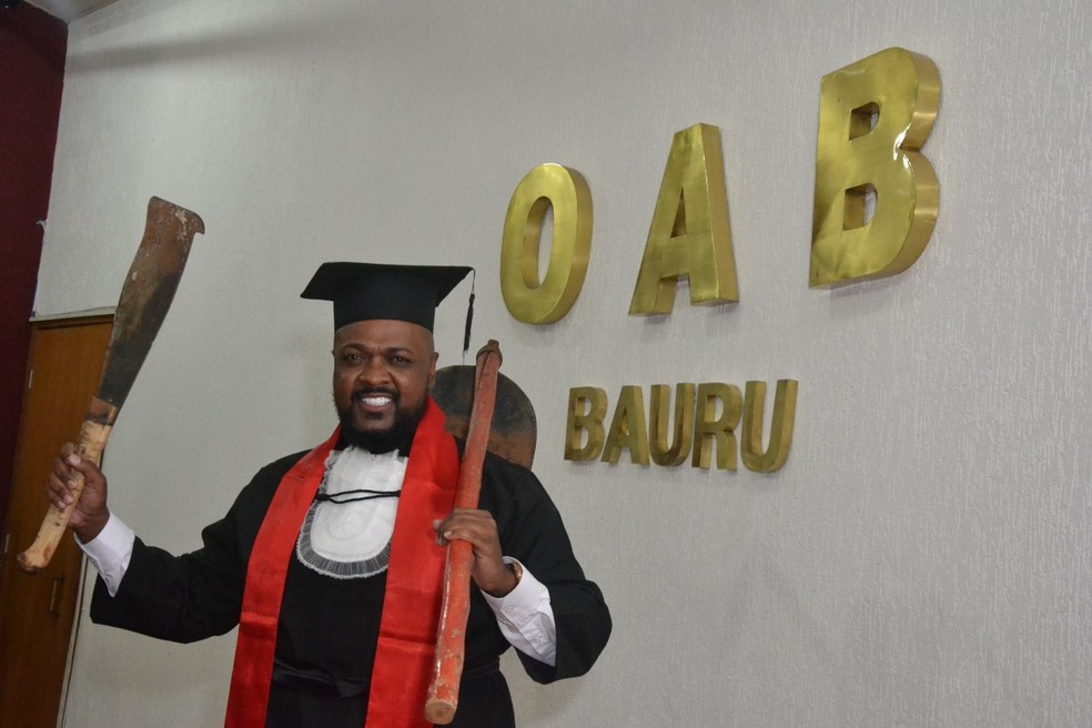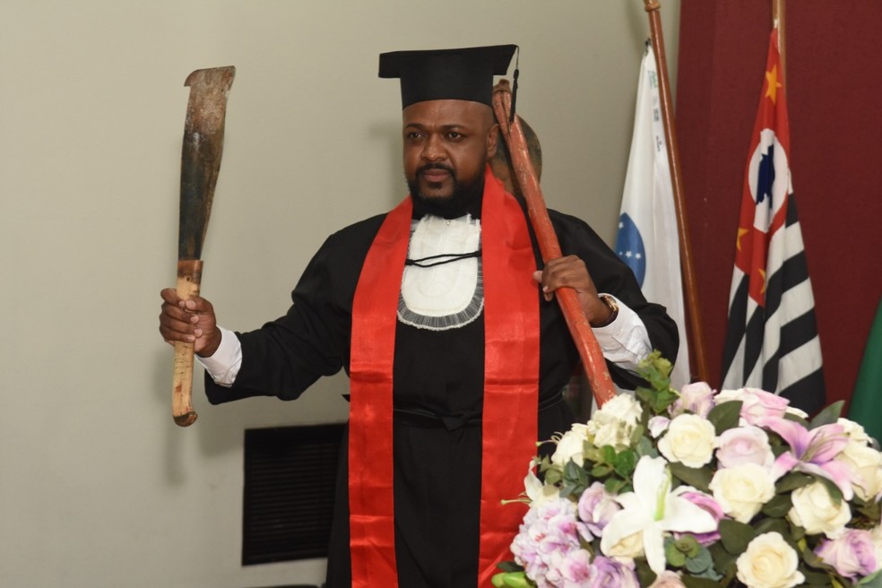 Em meio à cerimônia de colação de grau da turma de Direito em Bauru (SP), Agnaldo Araújo, de 44 anos subiu ao palco vestido com a clássica beca preta e carregando um facão e uma enxada.