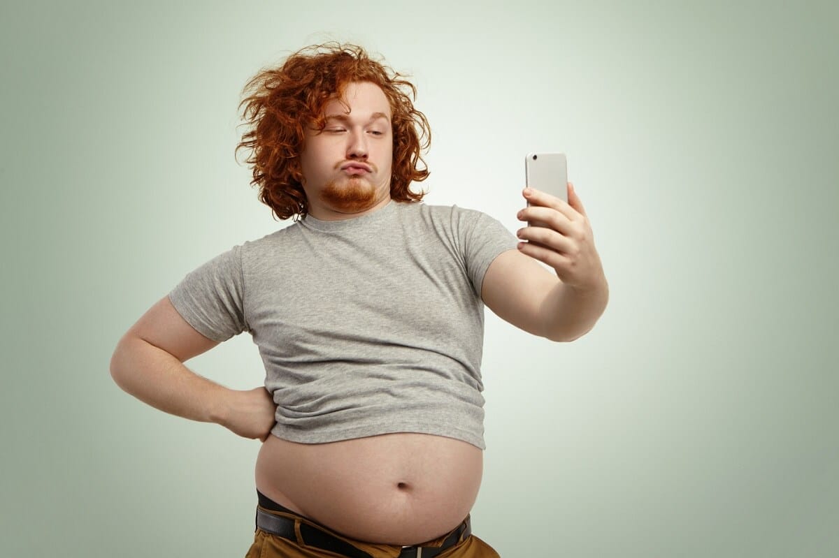 Funny overweight plump man with duck lips wearing undersize t-shirt with belly hanging out of pants, keeping hand on waist, posing for selfie, holding cell phone, trying to seem attractive and sexy
