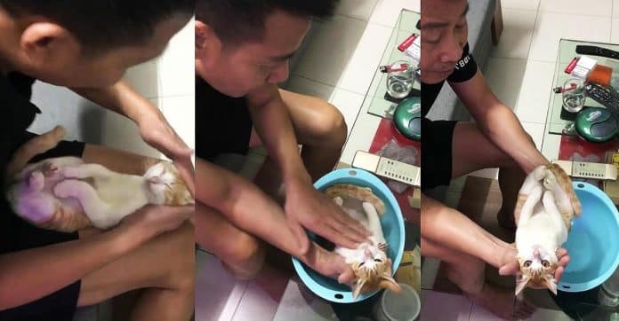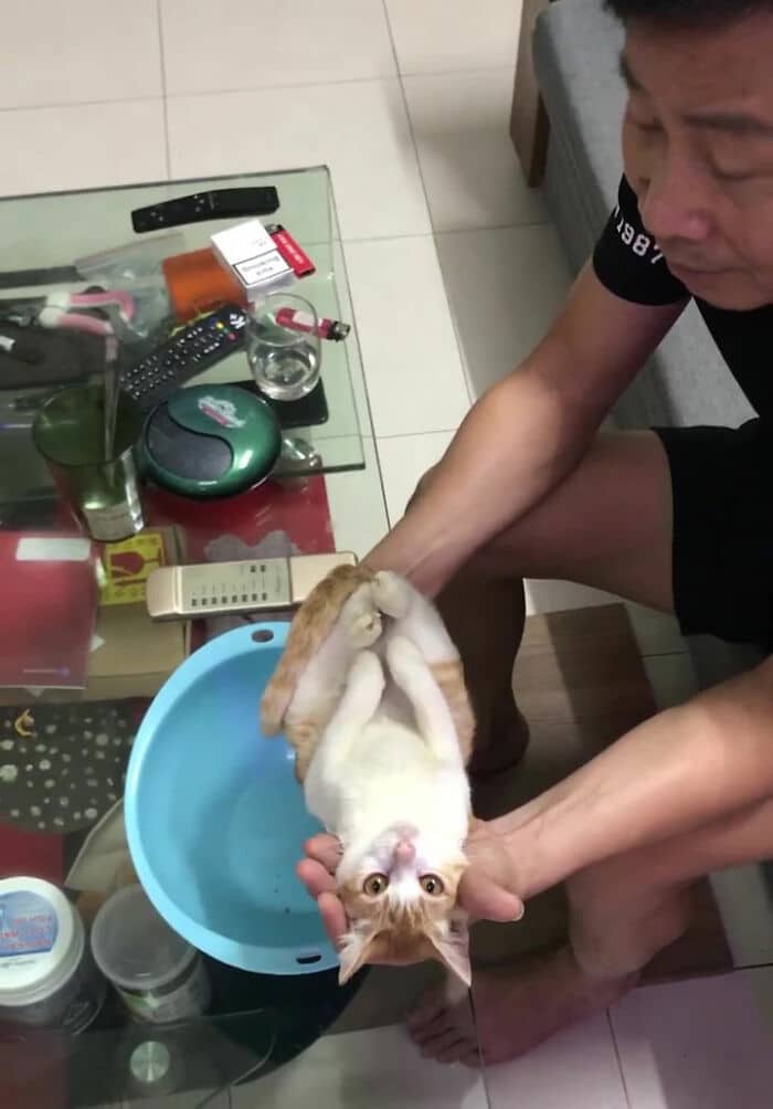 O avô vietnamita estava ajudando seu filho, Vinh Quang Phạm, a se preparar para o futuro da paternidade, mostrando-lhe o processo de dar banho em um bebê recém-nascido. Em vez de usar uma boneca ou bebê de verdade, o avô usou seu gato.