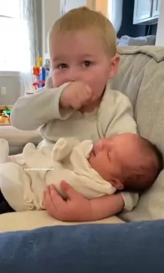 No vídeo, o menino pode ser visto segurando sua irmãzinha em seus braços. Ele não conseguia parar de olhar para seu rosto minúsculo enquanto ela fazia pequenos movimentos com os braços, e quando ele finalmente levantou a cabeça, seus pais perceberam que suas lágrimas estavam fluindo.