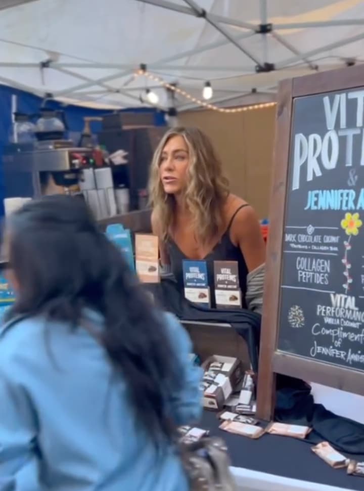 A atriz Jennifer Aniston, 53 anos, famosa pelos papéis na série ‘Friends’ e pelos filmes ‘Marley & Eu’, ‘O Todo Poderoso’, ‘Quero Matar Meu Chefe’, entre outros, foi flagrada vendendo sua linha de biscoitos e cereais naturais em um mercadinho improvisado.