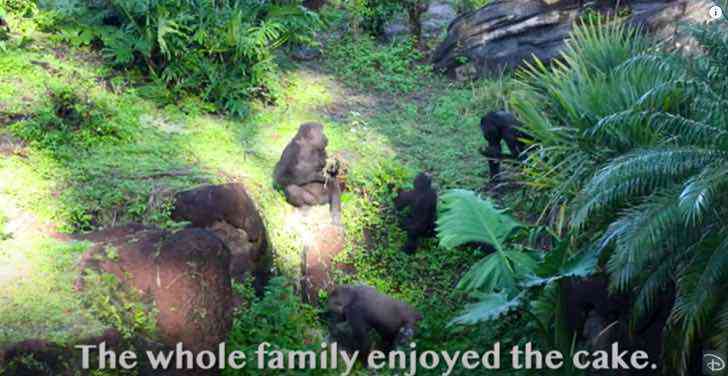 A filha de Gino, chamada Lilly, viu o bolo na frente dele e o levou para dividir com os demais integrantes do grupo. Em outra cena do vídeo compartilhada pela Disney Parks, todos os gorilas podem ser vistos sentados na grama comendo o bolo, incluindo Gino.