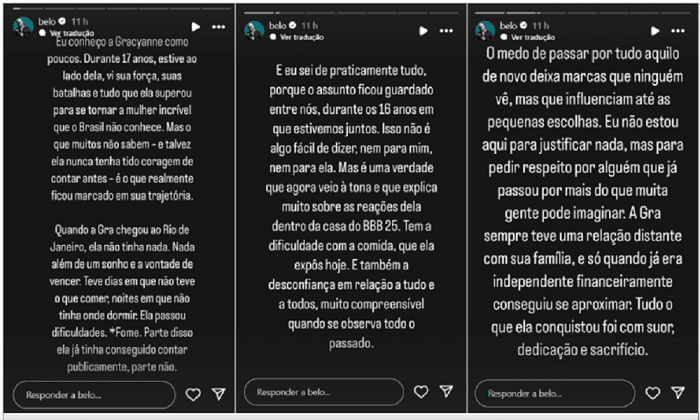 Belo iniciou seu relato ressaltando que a mídia desconhece as dificuldades enfrentadas por Gracyanne ao longo de sua vida. “Eu conheço a Gracyanne como poucos. Durante 17 anos, estive ao lado dela, vi sua força, suas batalhas e tudo que ela superou para se tornar a mulher incrível que o Brasil não conhece. Mas o que muitos não sabem – e talvez ela nunca tenha tido coragem de contar antes – é o que realmente ficou marcado em sua trajetória”, declarou.