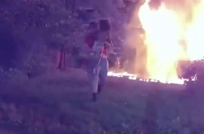 O Bom Samaritano gritou e acabou entrando na casa. Não havia fumaça e as luzes estavam acesas lá dentro. A casa parecia já ter sido evacuada.