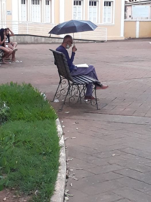 “Tirei essa foto maravilhosa hoje. Todos os dias quando saio do trabalho esse moço está lendo nesse banco da praça, ele lê em voz semi alta como que assimilando melhor o que lê, hoje estava uma chuvinha fina e olhem como ele estava lendo. Não me contive e perguntei o que ele lê, ele disse que lê tudo que consegue arrumar de livros. Vou doar amanhã alguns pra ele. Sabe Deus que dor a leitura ajuda a amenizar.”