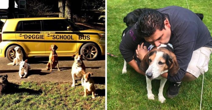 Quando eles ouvem o rapaz chegar, vários dos cães imediatamente saem de suas casas e embarcam no ônibus porque estão muito animados para ir à “escola”.