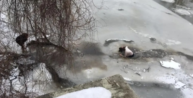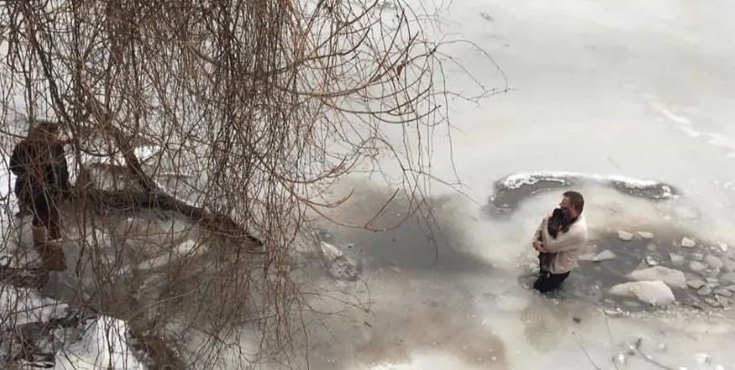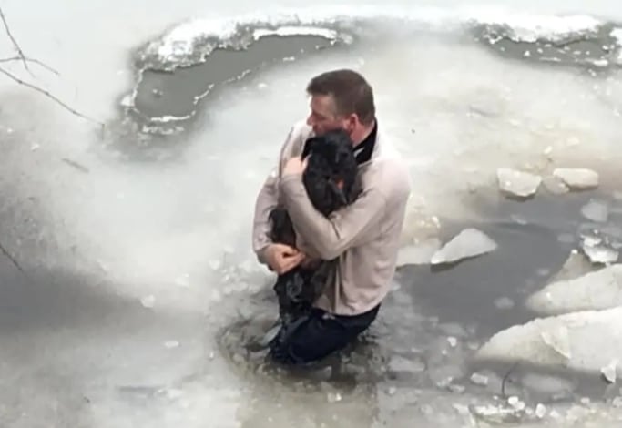 Um homem de grande coração não pensou duas vezes em pular em um lago congelado para salvar a vida de um cachorrinho que estava se afogando.