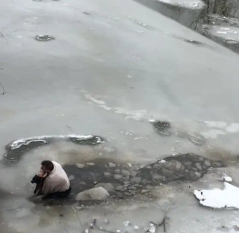 Sem hesitar, ele atravessou a camada de gelo e água, alcançando o pobre Jackson.
