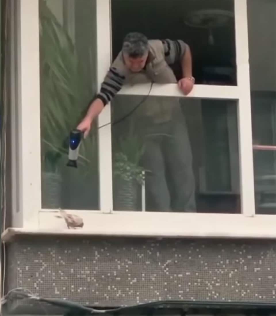 Sensibilizado com a situação do pássaro, Yilmaz decidiu secá-lo de uma maneira no mínimo criativa, usando um secador de cabelo.