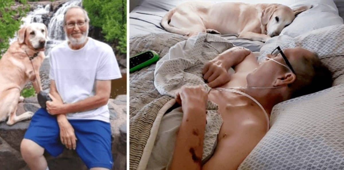 Essa história comovente circulou no Facebook, tocando o coração de muitas pessoas. Chris Hove compartilhou a foto de seu pai junto com o fiel Labrador, escrevendo “Goodnight dad, goodnight Gunner”.