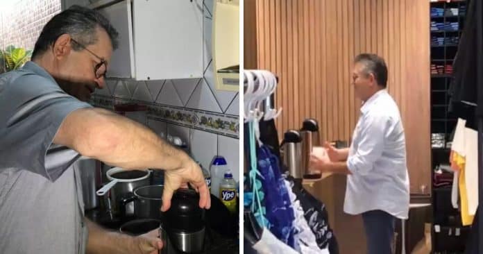 Todos os dias, antes de abrir as portas de seu estabelecimento, Itamar distribui doses de quatro garrafas grandes de café entre os funcionários do ambiente, e deixa também para os seus clientes da livraria.