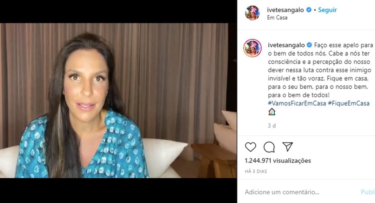 Veja, abaixo, o apelo de Ivete para que fiquemos em casa: