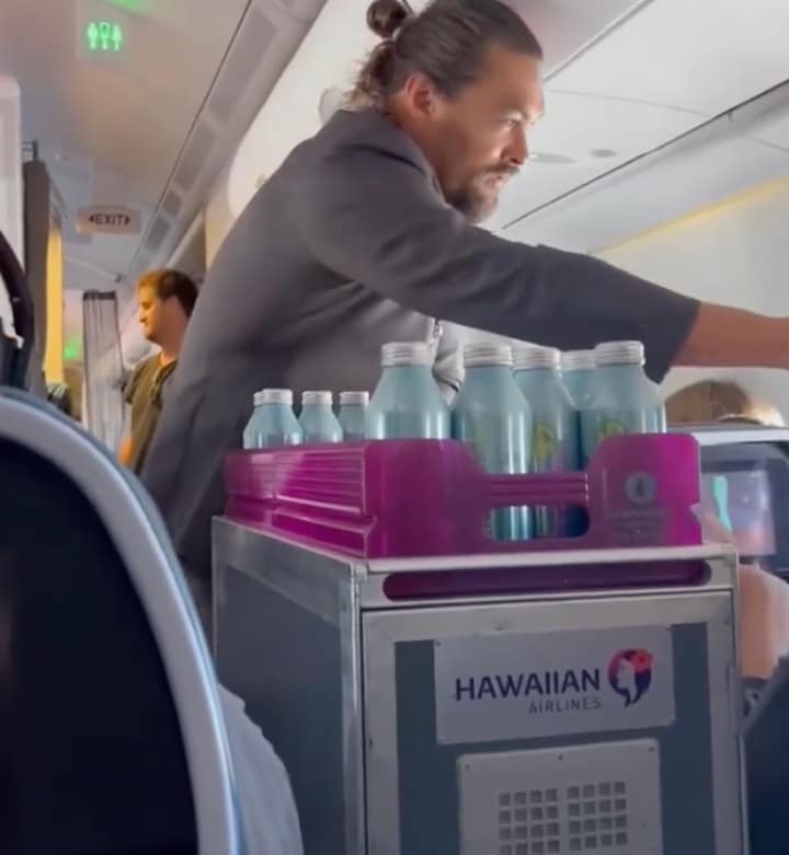 Em vez de um comissário de bordo empurrando o carrinho de bebidas, havia o próprio ator Jason Momoa, que gentilmente serviu a todos os passageiros do voo sua água Manalu, que é sustentável. Os viajantes não podiam acreditar no que viam!