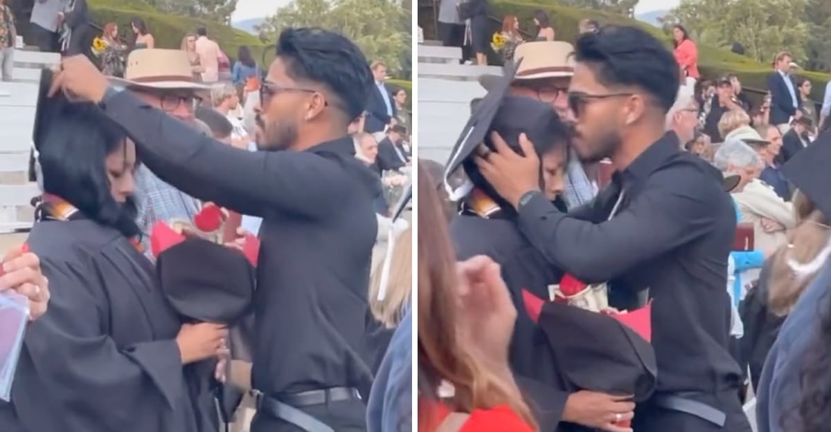No meio da comemoração, Antonio saiu do protocolo e aproximou-se da mãe, tirou o boné e a beca para colocá-los nela como sinal de que a conquista não era só dele, mas de ambos.