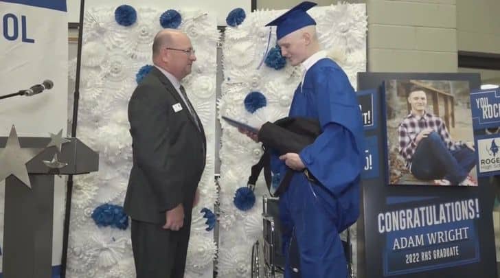 Tudo foi providenciado com antecedência pela própria escola, a Rogers High School , e também pela Highlands Oncology, onde Adam é um paciente. Desta forma, como sua família e amigos esperavam, o jovem recebeu seu diploma.