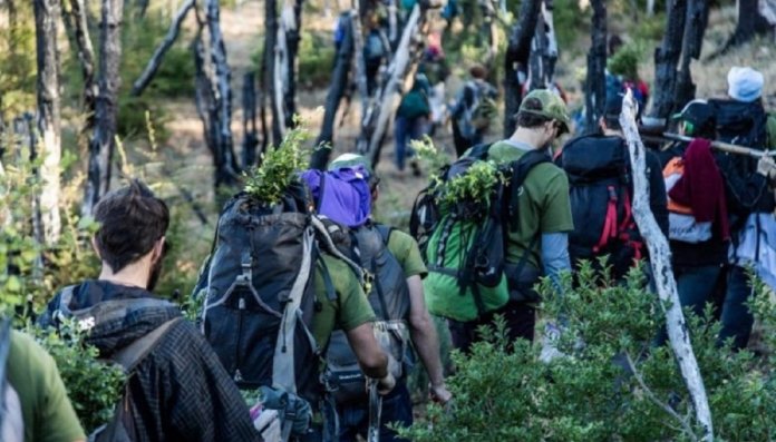 Carregando pesadas mochilas cheias de plantas e pás, os jovens plantaram 12.000 árvores, ao longo de quatro dias.