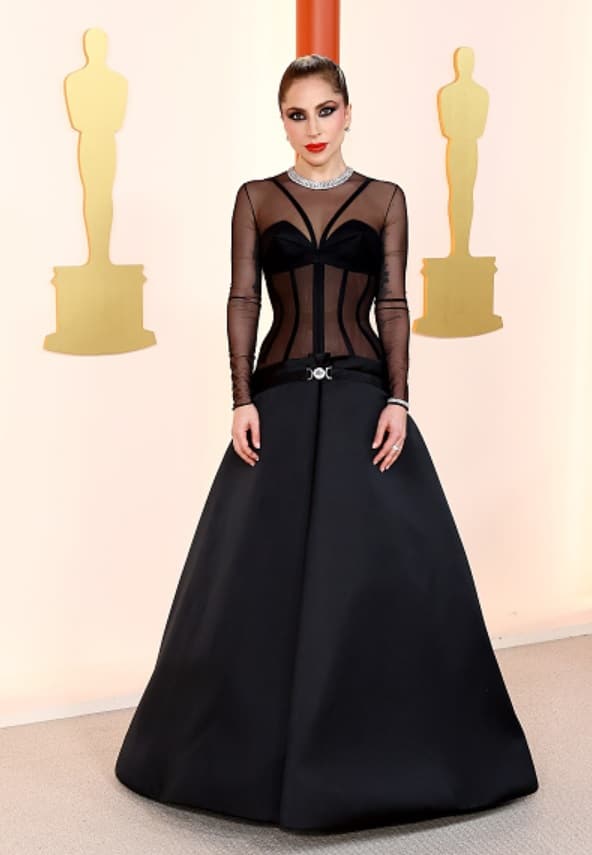 No entanto, a poucos dias do evento, Gaga surpreendeu a todos ao confirmar sua presença e prometeu uma apresentação especial. No tapete bege do Oscar deste ano, Gaga deslumbrou com um vestido Versace preto, com transparências e uma saia decotada que ostentava o icônico logotipo da Medusa.