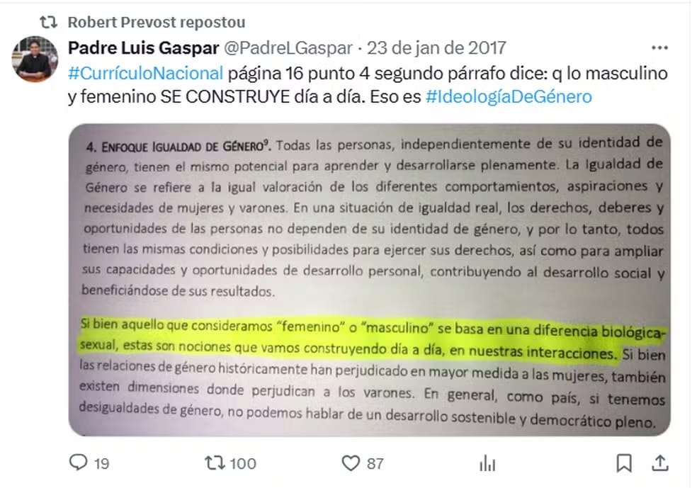 Leão XIV já compartilhou críticas à proposta do governo peruano de incluir temas de identidade de gênero no currículo nacional. Embora a expressão “ideologia de gênero” não tenha base científica, ele interagiu com conteúdos que questionavam a abordagem do Estado.