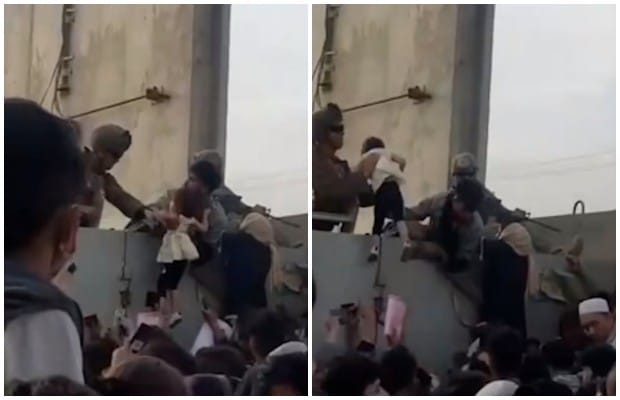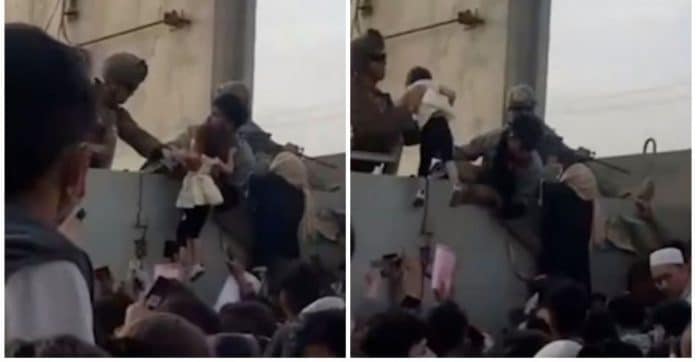 Em um vídeo divulgado nas redes sociais, uma mãe afegã desesperada entrega sua filha bebê a um soldado americano no aeroporto de Cabul, na tentativa de fazê-la deixar o país.